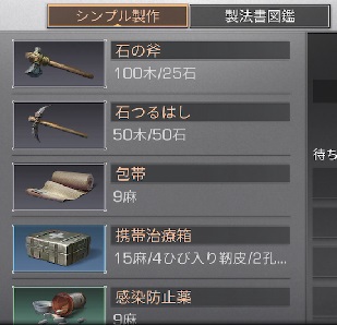 いままで「木」や「石」が表示されていましたがマテリアルの数の表示に変わります。そうです、この「ナノマテリアル」でシンプル製作のアイテムを作ることが出来るようになります。今まで「木」や「石」など多くの素材が、それぞれ必要だったのが、今後は「ナノマテリアル」があれば製作することが可能になります。