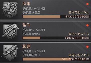 ブログ主の熟練度ですが、戦闘熟練度が採集や製作と比べて凹んでいます。原因は分かっています戦闘不足です。いかに日程の勤務ポイント160を速く達成することを重視して、フィールドに出ても感染者や兵士はスルーして戦闘回避するプレイばかりしていました。ちょっと意識して戦闘熟練度を上げる必要があります。