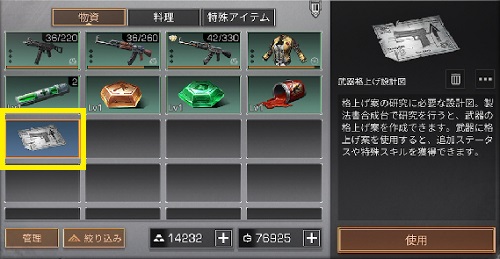 リュックを開けて購入した武器格上げ設計図を選択して「使用」をタップ。