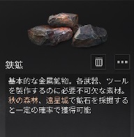 錫鉱、木の芯は「砂石の城」、鉄鋼は「秋の森林」での採集となります。この時点で効率が非常に悪いです。