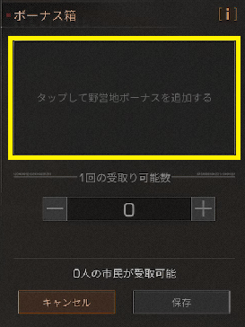 ボーナス箱の中身を野営地金庫内にある資源に変更することがあります。左に選択物資の一覧が表示されますが、ボーナス箱の中身にできるのは残量が10個以上の物資となります。
